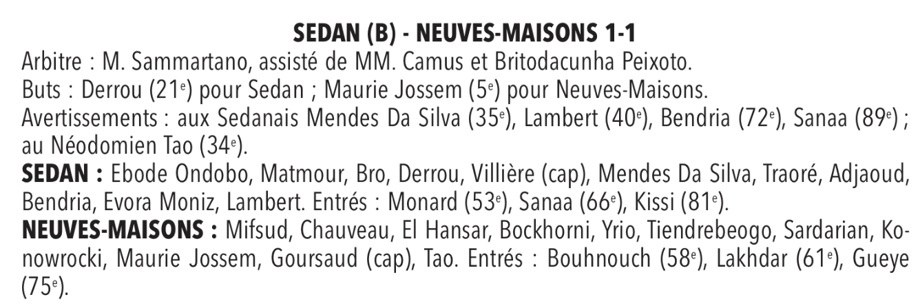 il y a une interrogation concernant le double buteur : ce serait Ali Bendria selon le club et non Derrou selon l'Ardennais qui a scoré .