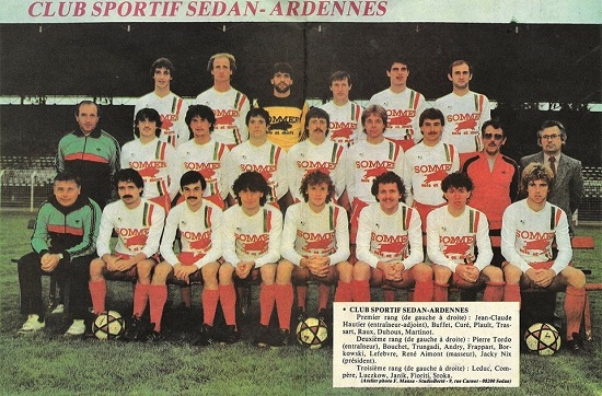 Pour fêter le retour de Sedan en D2 au printemps 1983, on revient à des éléments classiques (couleurs et un sanglier sur le maillot) (Photo de Francis Mansu)